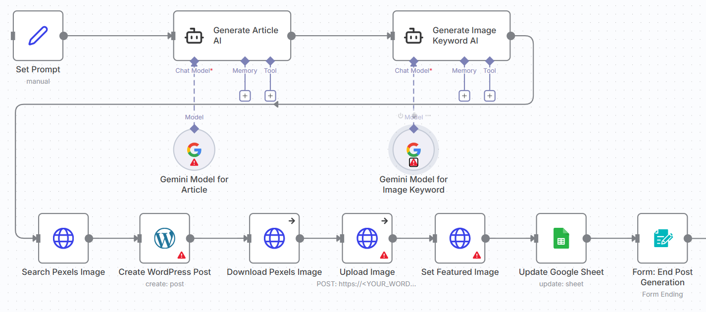 Im nächsten Schritt ruft der Node „Generate Article AI“ das Sprachmodell Google Gemini auf. Das Modell erstellt einen SEO-optimierten HTML-Artikel mit Überschriften, Absätzen und optionalen Meta-Informationen. Der Text kann bereits Keywords, interne Verlinkungen und Zwischenüberschriften enthalten.
